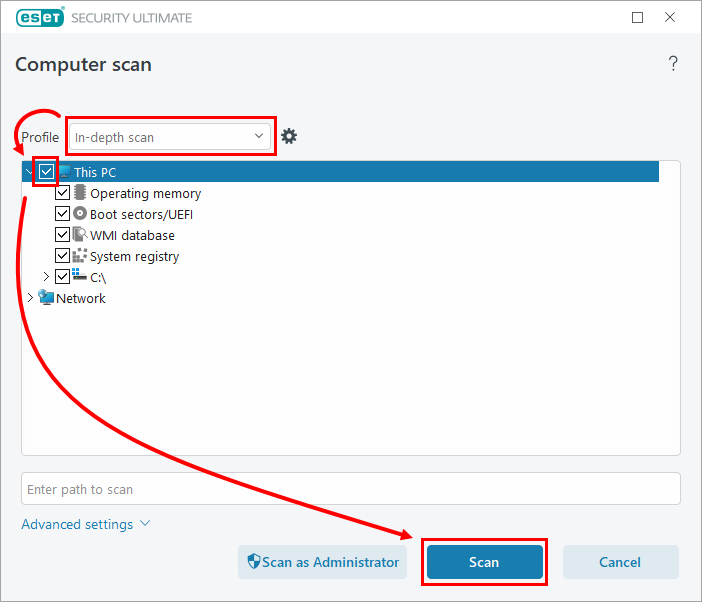 Select In-depth scan from the drop-down menu next to Profile. Select the check box next to Computer or This PC and click Scan.
