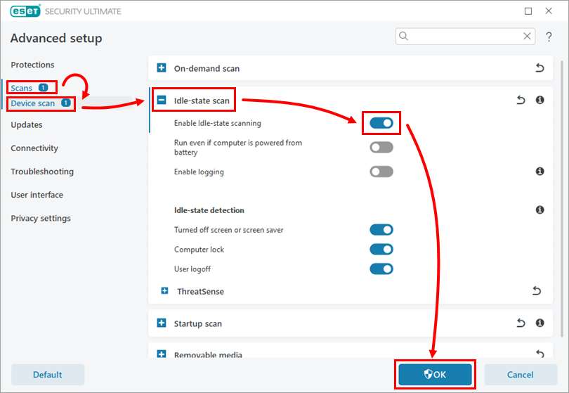 Click Scans → Device scan. Expand Idle-state Scan. Click the toggle next to Enable Idle-state scanning to enable it. Click OK to save your changes and exit Advanced setup.