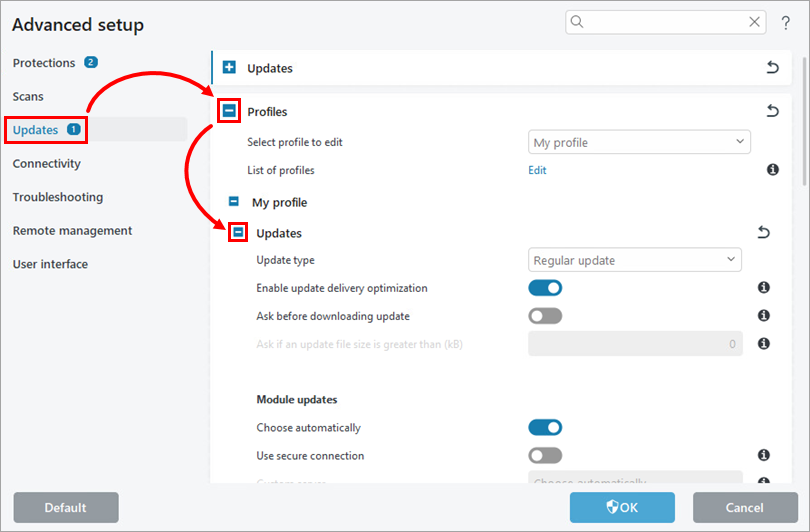 Faceți clic pe Actualizări, extindeți Profiluri → Actualizări.
