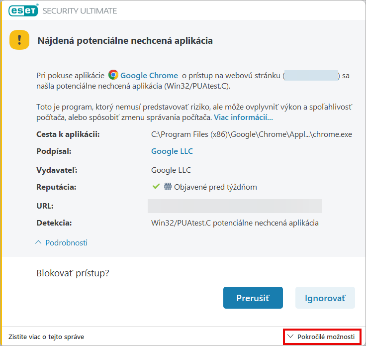 Detekcia potenciálne nechcenej aplikácie na internete (pri sťahovaní)