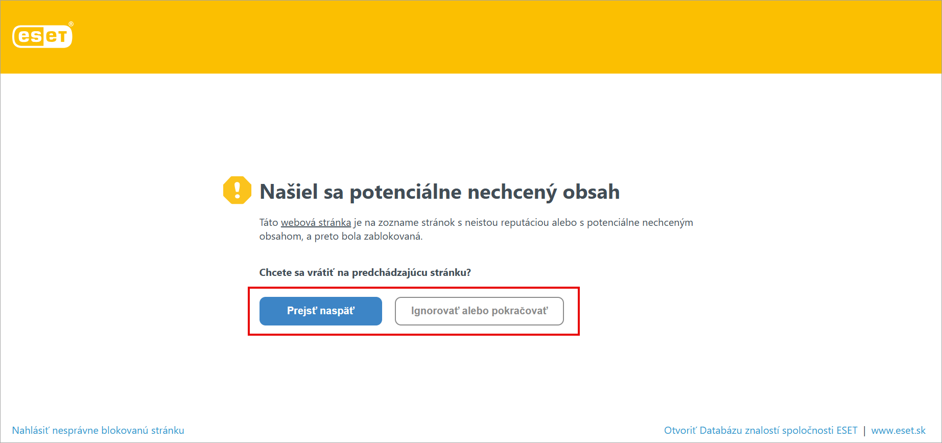 Ak sa zobrazí upozornenie, že stránka, ktorú sa pokúšate navštíviť, je klasifikovaná ako potenciálne nechcený obsah, môžete kliknúť na možnosť Prejsť naspäť, čím odídete zo zablokovanej webovej stránky, alebo na možnosť Ignorovať alebo pokračovať, čím povolíte načítanie stránky.