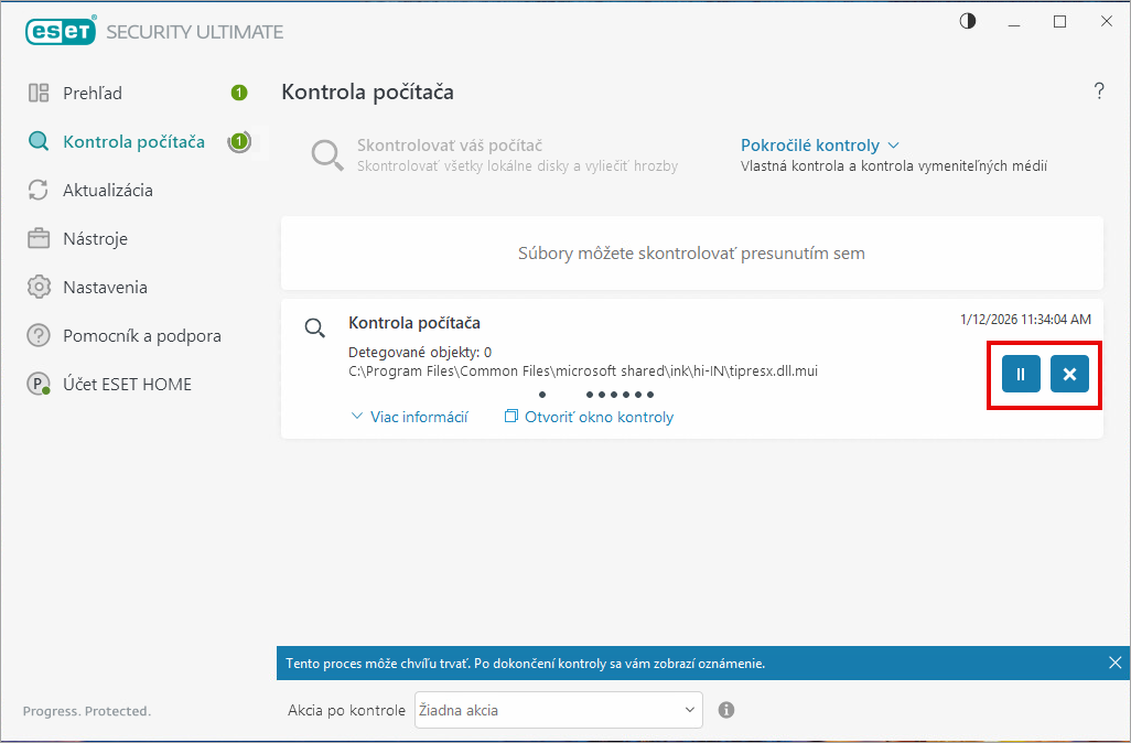 Počkajte na dokončenie kontroly. Kontrolu môžete kedykoľvek pozastaviť alebo zrušiť kliknutím na ikony Pozastaviť (||) alebo Zrušiť (X).