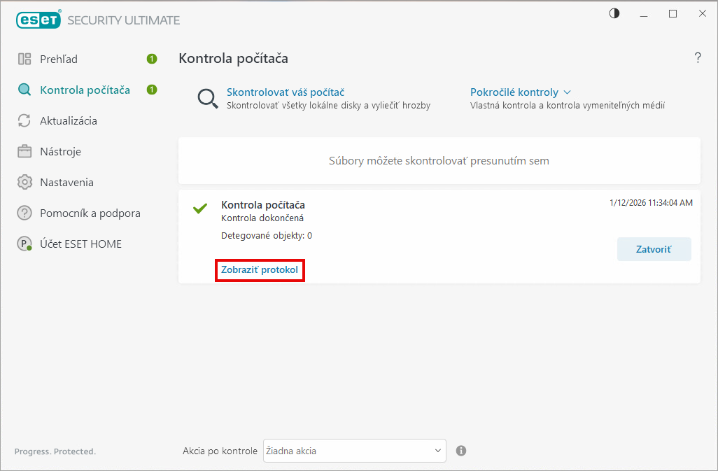 Po dokončení kontroly sa zobrazí prehľad informácií o počte skontrolovaných, infikovaných a vyliečených objektov. Ak si chcete pozrieť podrobné výsledky kontroly počítača, kliknite na Zobraziť protokol.