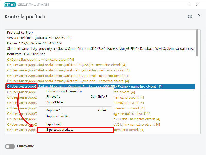 V okne Kontrola počítača kliknite pravým tlačidlom myši na protokol a potom na možnosť Exportovať všetko.