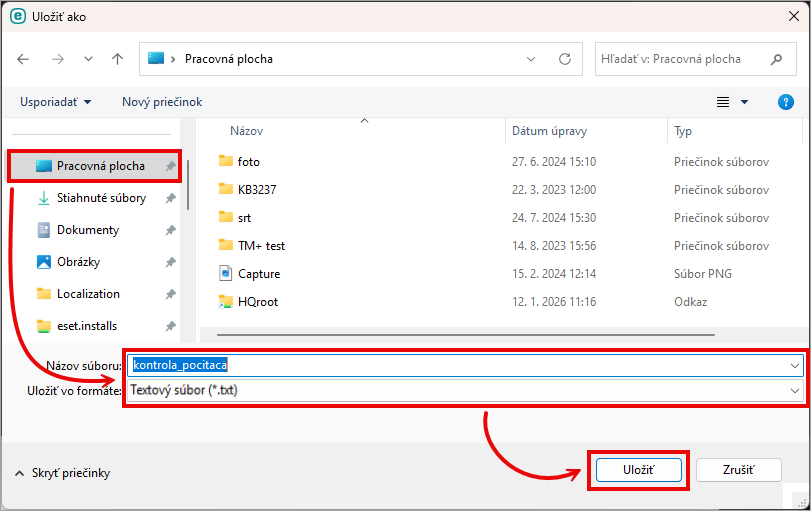 Vyberte, kam sa má protokol uložiť, a zadajte názov súboru. Z roletového menu Uložiť vo formáte vyberte Textový súbor (*.txt) a následne kliknite na Uložiť.