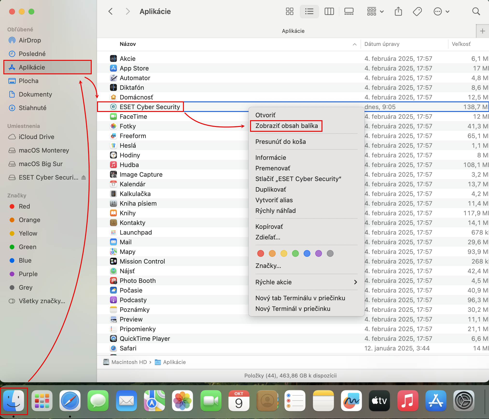 Kliknite na Finder → Aplikácie. Podržte Control a kliknite (alebo kliknite pravým tlačidlom myši) na ESET Cyber Security a vyberte Zobraziť obsah balíka.
