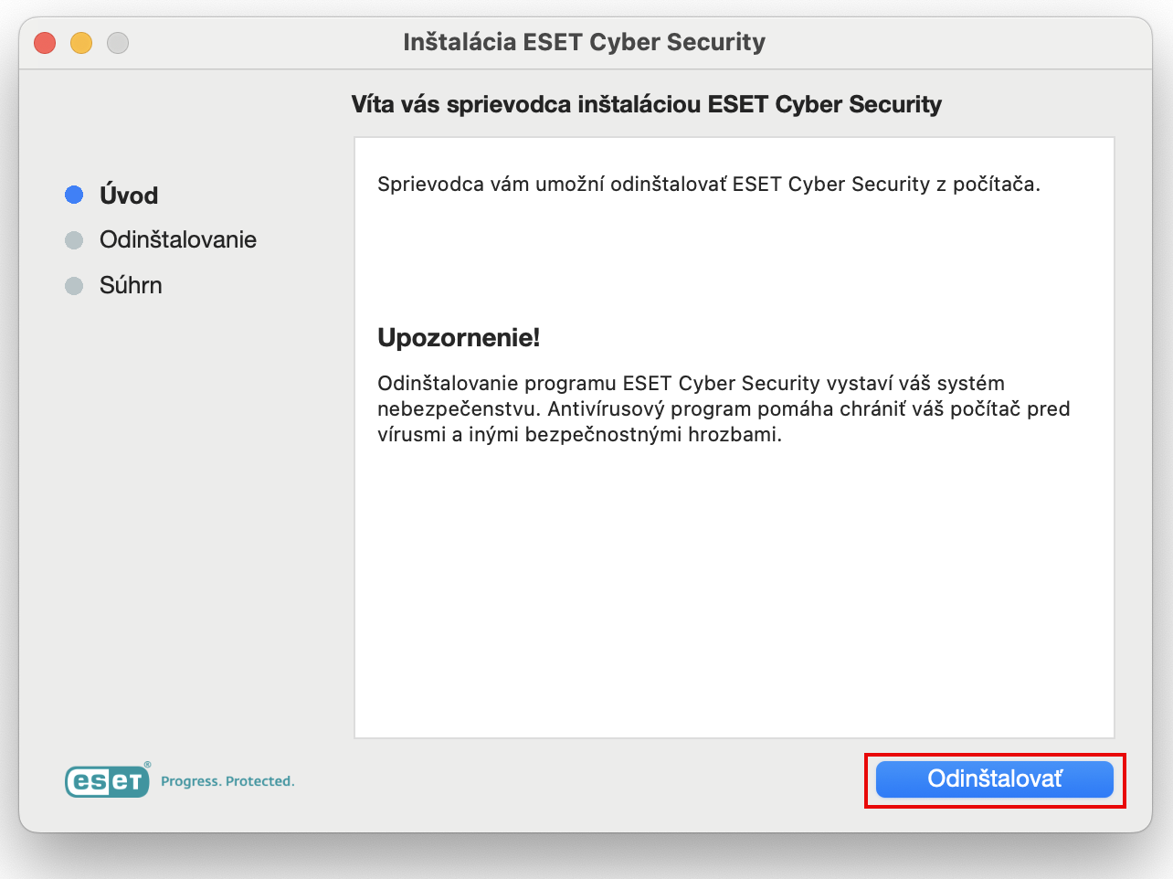 V okne Inštalácia ESET Cyber Security kliknite na Odinštalovať. Na úspešné odinštalovanie programu ESET Cyber Security možno bude potrebné počas odinštalácie niekoľkokrát zadať heslo.