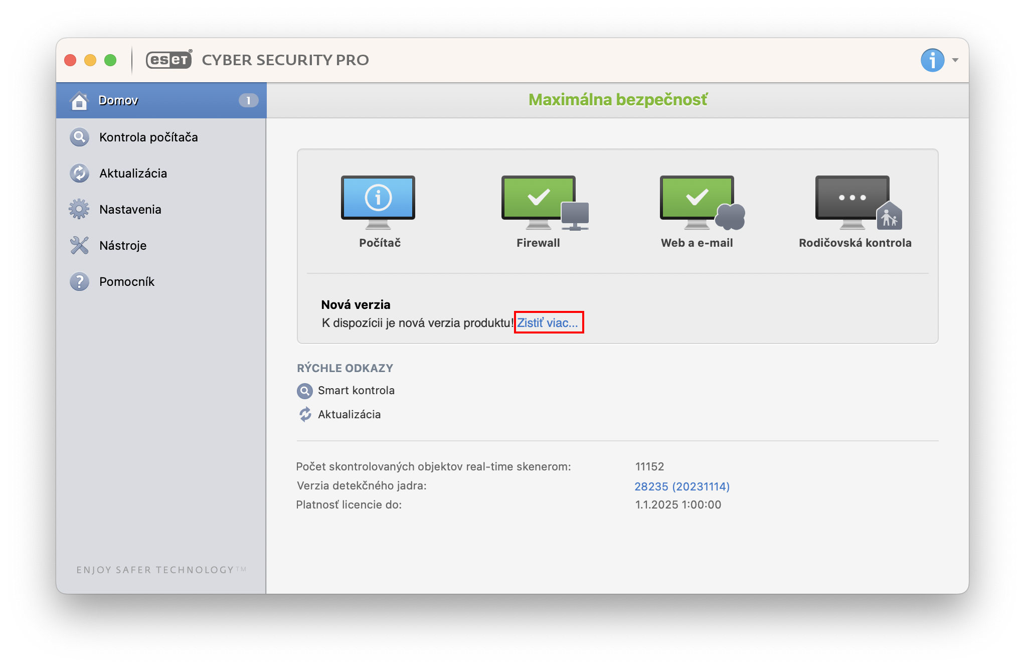 Otvorte hlavné okno bezpečnostného produktu ESET Cyber Security.