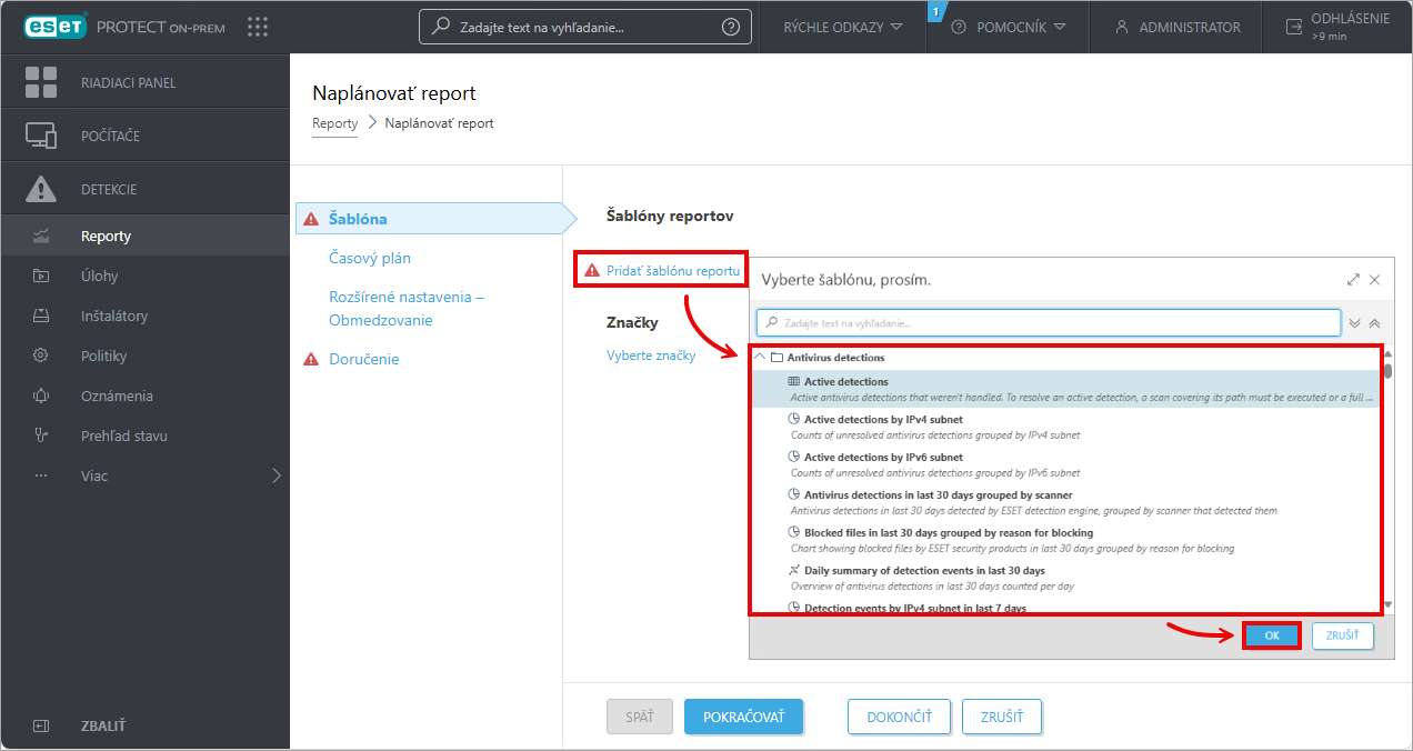 Kliknutím na Pridať šablónu reportu pridajte šablónu reportu, ktorý chcete naplánovať. Vyberte požadovanú šablónu zo zoznamu (v tomto príklade je vybraná šablóna Aktívne detekcie) a kliknite na OK.