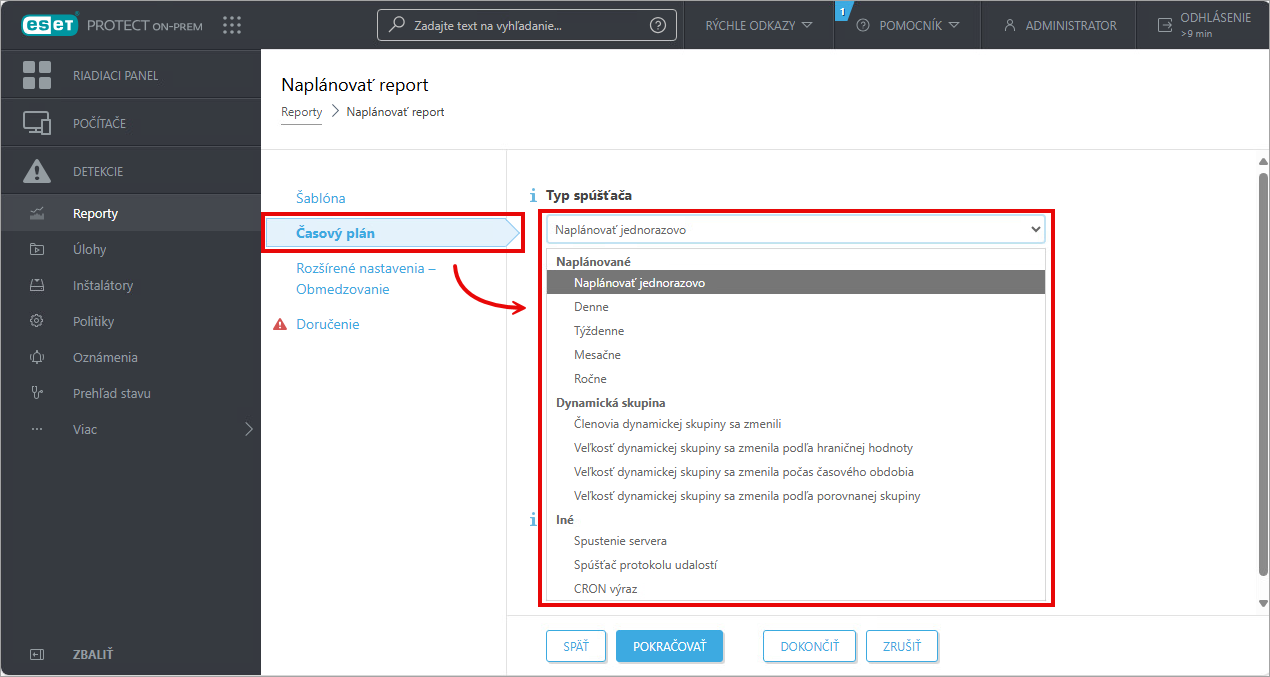 Kliknite na Časový plán a z roletového menu Typ spúšťača vyberte niektorú z dostupných možností.