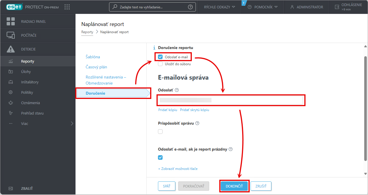 Kliknite na Doručenie, v časti Doručenie reportu začiarknite políčko vedľa položky Odoslať e‑mail a do poľa Odoslať zadajte e‑mail, na ktorý sa majú reporty odosielať. Kliknutím na Dokončiť naplánovaný report uložte.