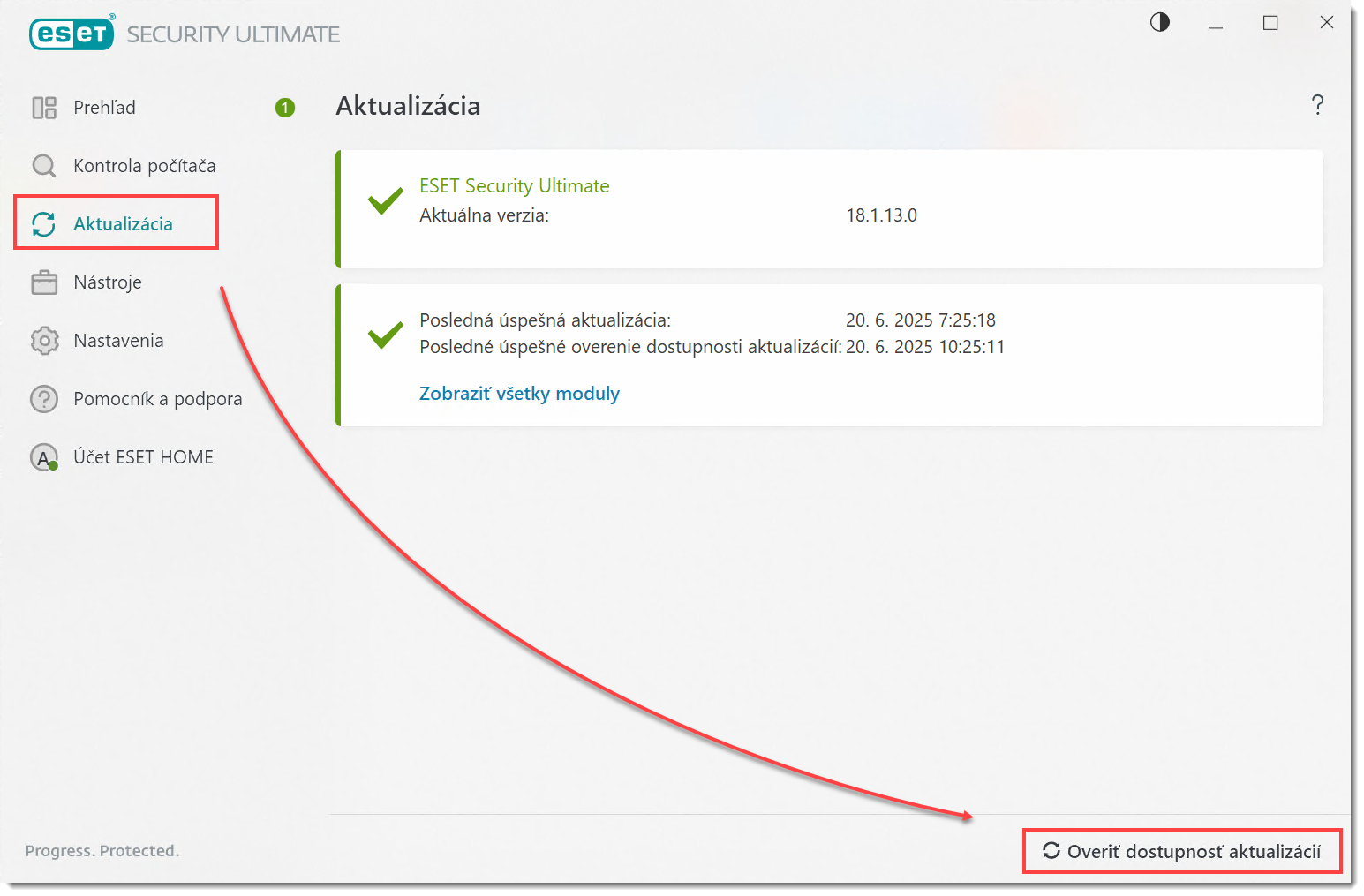 Kliknite na sekciu Aktualizácia → Overiť dostupnosť aktualizácií. Pozrite si najnovšie verzie produktov ESET.
