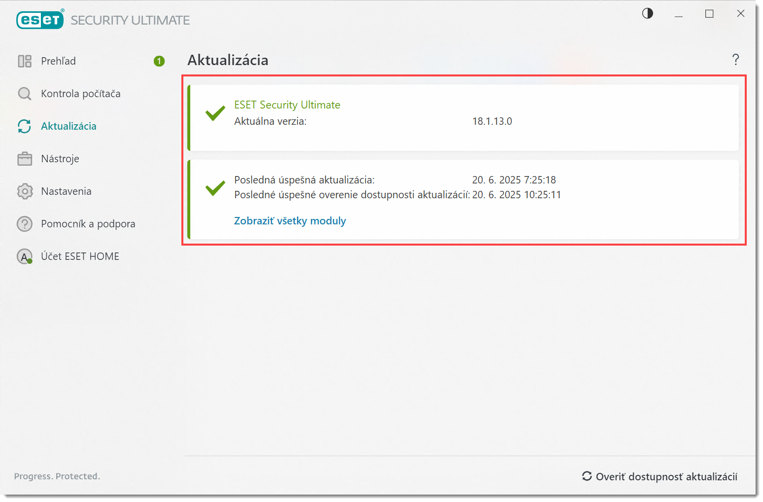 Bezpečnostné produkty ESET predvolene kontrolujú dostupnosť nových aktualizácií každú hodinu. Minimálne raz za deň sa v produkte aktualizuje detekčné jadro a moduly. Ak chcete zistiť, akú verziu konkrétneho modulu aktuálne používate v produkte ESET, prečítajte si tento článok databázy znalostí spoločnosti ESET.